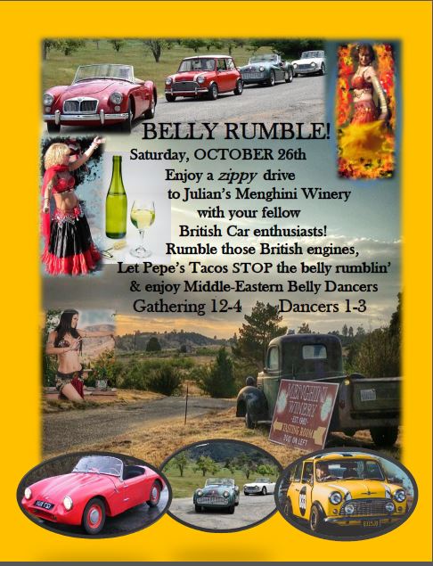 Belly Rumble – October 26, 2019 admin October 15, 2019 March 9, 2021 No Comments on Belly Rumble – October 26, 2019 October 26, 2019 from 12 to 4 PM Come, enjoy delicious wine, beautiful belly dancing, great food, and British cars!Menghini Winery is beautiful in the fall. Come, enjoy a relaxed day of festivities, cool cars, and community!